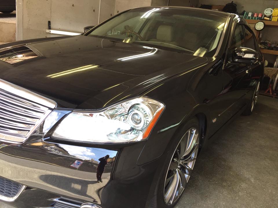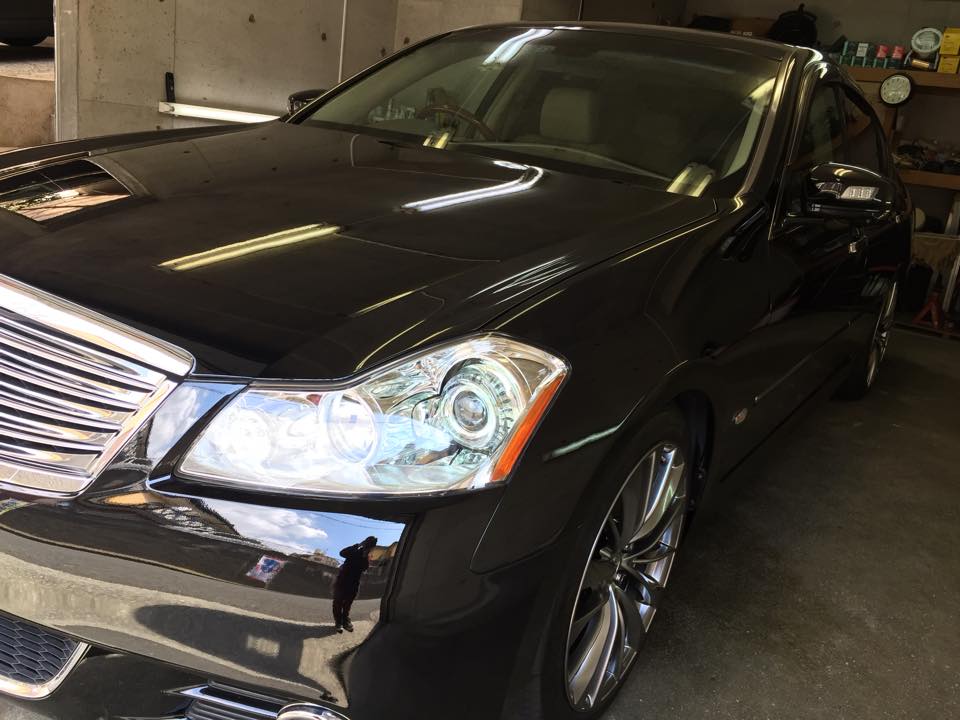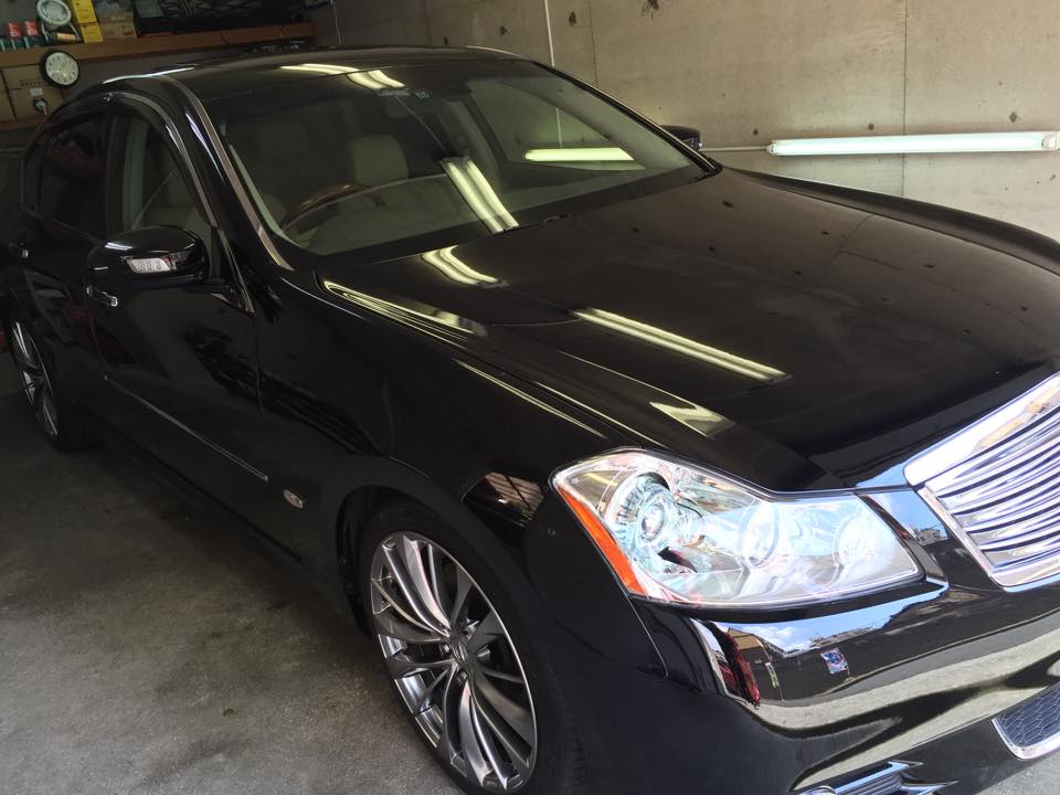 フーガにガラスコーティング(スタンダード)約1分こんにちは、カルロの永松です 昨日、サッカー日本代表の練習を見に行きました。 本田もいましたよ でも、30分ランニングだけ…。 ショック。 今日は常連様のフーガにカルロコーティングスタンダードです。 プレミアムを施工しているので、艶々ピカピカです。 これからも定期的によろしくお願いします