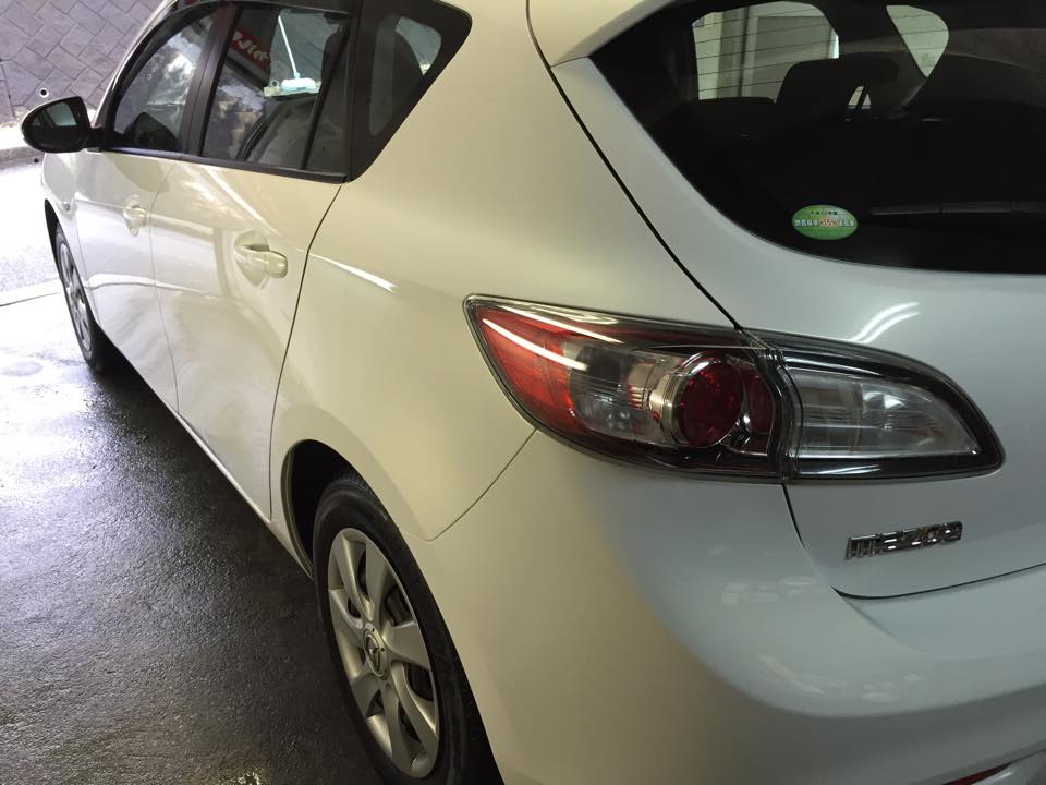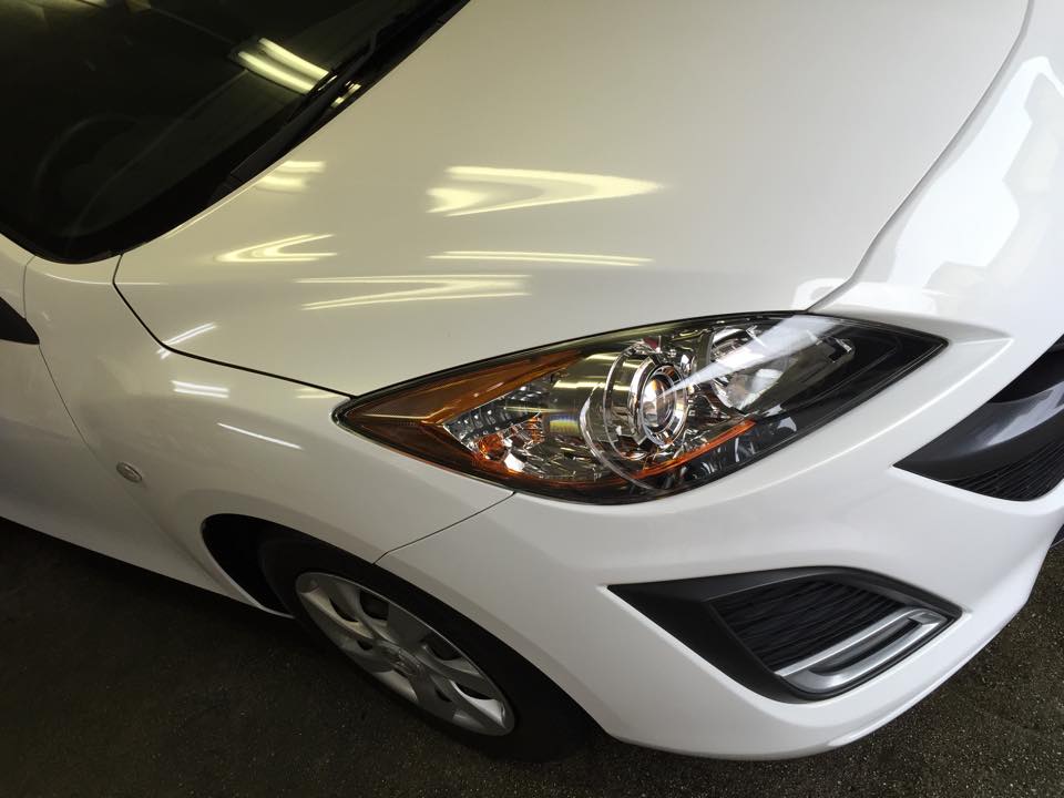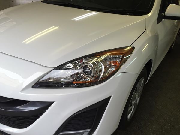 アクセラにガラスコーティング(プレミアム)約1分こんにちは、カルロの永松です。 昨日は雨、今日は真夏並みの暑さ。 体調が…。 頑張ります。 今日は熊本からの常連様、アクセラにカルロコーティングプレミアムです。 遠方よりいつも来店して頂いています。 火山灰が凄いみたいですが、洗車頑張ってくださいね。