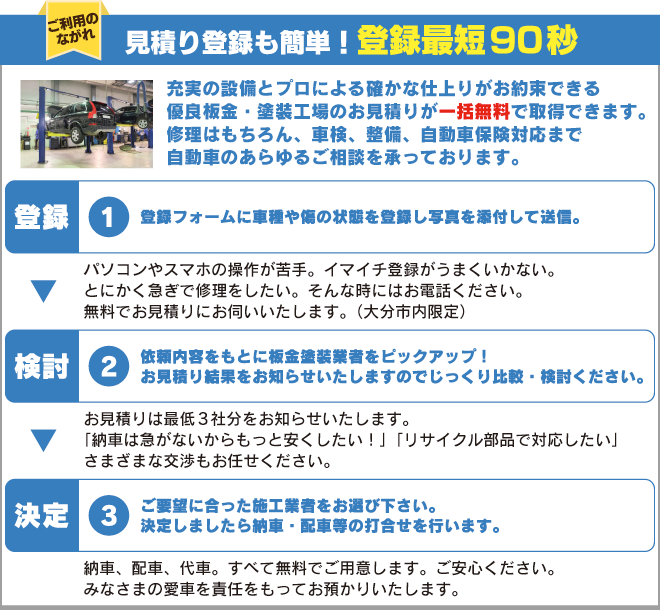見積りを取得するのは当社が厳選した設備・技術の優れた工場のみ。確かな技術と的確な作業で皆様の愛車を責任を持ってお預かりいたします。