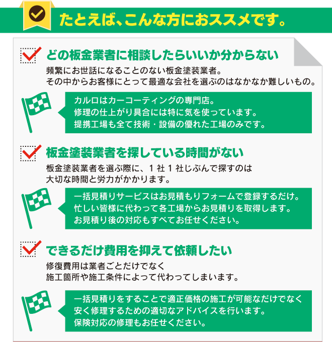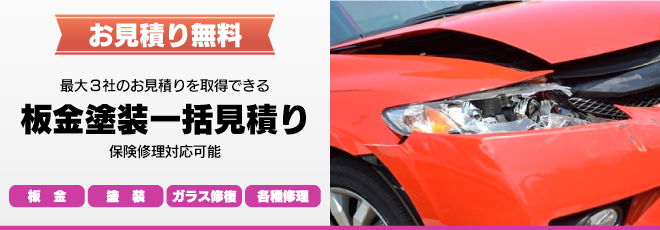 もしも事故に遭ってしまった時に、相談できる信頼のおける人が周りにいないと不安です。ヘコミや傷の修理は板金や塗装など専門的な知識と技術が必要となるため、ヘコミや傷の大小にかかわらず自力での修理は基本的には難しいことがほとんどです。専門業者さんでは、車の色やサイズ、破損した場所に応じて、適切な修復方法がとられ、元の状態に戻してくれるので安心です。しかし、修理工場には縁がない方がほとんどなので、設備や技術の優れた工場を探すのは大変な作業です。そこでカルロでは設備や技術に優れた修理工場から無料で一括見積りを取得できる板金塗装一括見積りを取得しお車のお引き取りから納車まですべて当社が代行で行う大変便利なサービスです。簡単に登録出来るお見積りフォームに入力するだけで最大3社に板金塗装工場から無料でお見積りを取得でき、仕上がりも万全のチェック体制でみなさまの愛車をお預かりいたします。